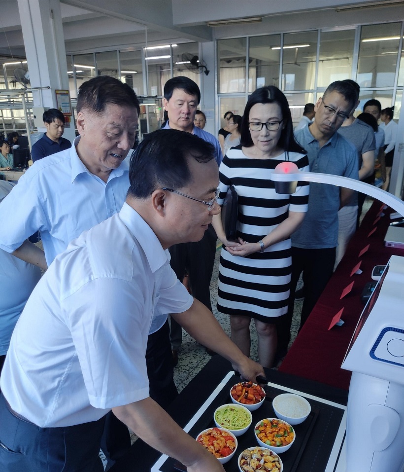在产品展示区,我集团的人工智能新产品——机器人收银员精采亮相,引起了考察团的浓厚兴趣。杨子云进行了产品现场演示,于广洲及考察团成员们兴致勃勃地进行了验证,并对我集团的自主产品创新工作给予了积极肯定。