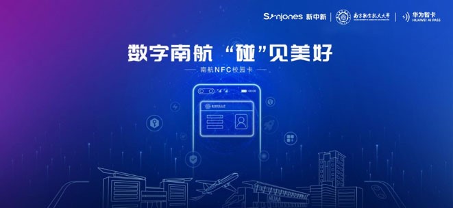2021年7月5日,南京航空航天大学、新中新集团和HUAWEI AI PASS三方联合召开了南航NFC校园卡上线发布会,三方共同携手打造全国首创的全场景手机NFC校园卡。学校师生可在食堂就餐、校内超市消费、图书馆借还书、校内门禁等多种场景下,手机一碰即可享受美好数字化体验,为师生们在学习、工作、生活上提供方便、快捷、安全的服务,让学习与生活更高效更自由,实现“一卡在手,走遍校园”。