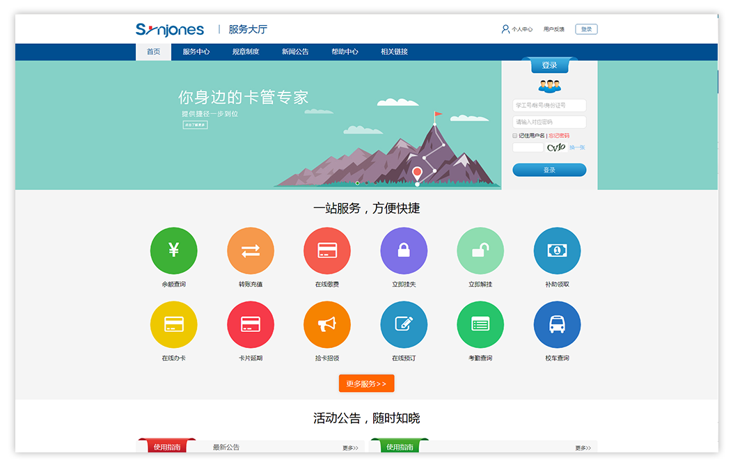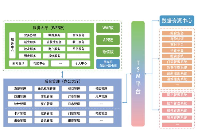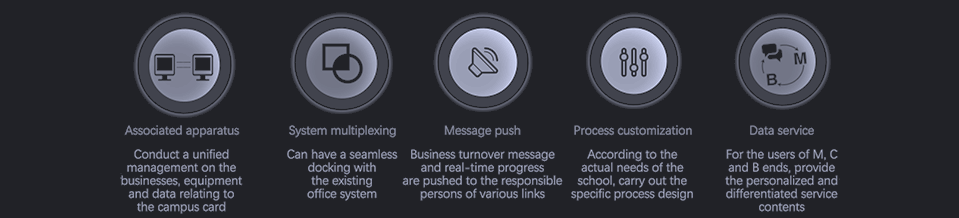 As a school integrated service platform, the service hall will integrate the campus card service, payment service, attendance service, reservation service and other series of services, optimize the business processes, and provide the online business handling, data query & statistical analysis and other services; at the same time, combined with the application of self-service terminal equipment, achieve the office automatization & mobilization, improve the work quality and work efficiency, improve the customer satisfaction, reduce unnecessary resource investment, and provide more convenient, faster and more efficient one-stop services for all teachers and students.