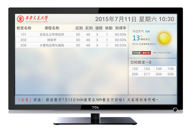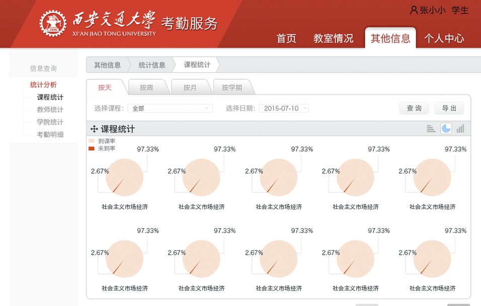 实时观察教室使用情况与老师上课情况,统计课程考勤率。