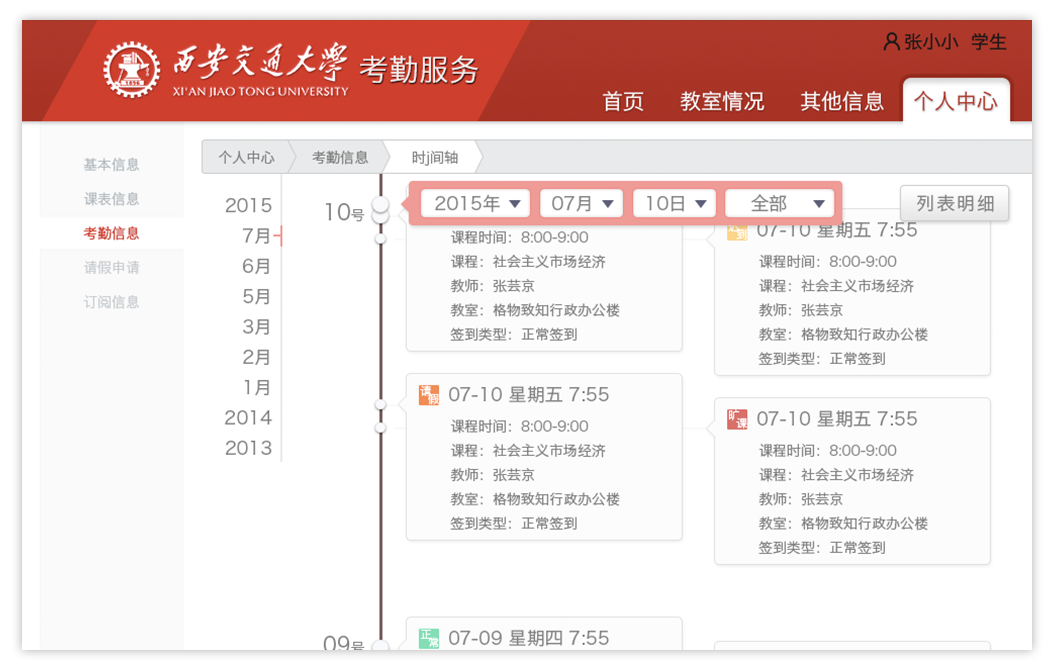 登录考勤服务平台进行课表信息、考勤情况、请假情况的查询,可以在线提交请假申请,进行教室预订、查询老师上课情况等信息。