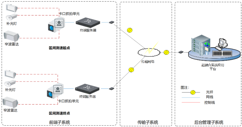 系统由区间测速监测设备、中心控制设备及软件等组成。区间测速监测设备分别安装在测速区间的入口、出口处,实现机动车通行特征的记录、识别、数据传输等功能;中心控制设备及软件负责接收区间测速监测设备记录的车辆信息及全景特征,实现测速区间的监测点设备管理、区间测速、违法信息生成、查询统计、时钟同步等功能。