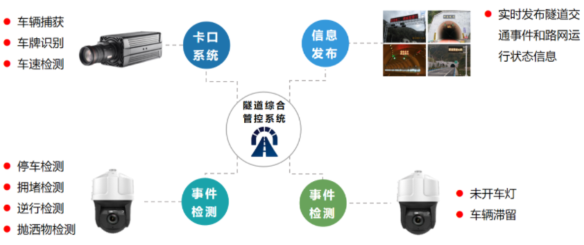 隧道综合管控系统由卡口系统、异常事件检测系统及道路交通诱导屏组成,系统可实现隧道内机动车异常事件、隧道内有行人、隧道内机动车违法变道等异常交通行为自动检测及报警,同时记录报警录像和报警图片,支持违法行为的实时取证。